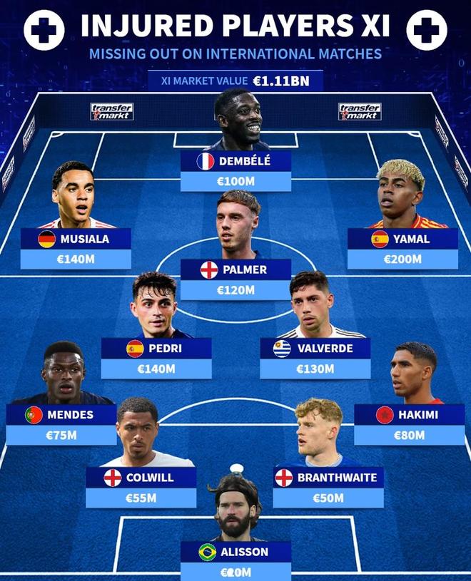 北京时间11月15日,德周计算出了因伤缺席本月国际比赛日的11名队员中身价最高的队员。亚马尔和登贝莱领衔,其他成员还包括穆夏拉、帕尔默、佩德里和巴尔韦德。根据德国转会统计,本月国际比赛中因伤身价最高的11名球员分别是:门将阿利森(巴西/利物浦)2000万欧元、后卫阿什拉夫(摩洛哥/巴黎圣日耳曼)8000万欧元、布兰斯维特(英格兰/埃弗顿)5000万欧元、科尔韦尔(英格兰/切尔西)5500万欧元和努诺·门德斯。中场(葡萄牙/巴黎圣日耳曼)7500万欧元,埃尔维德(乌拉圭/皇家马德里)1.3亿欧元,佩德里(西班牙/巴塞罗那)1.4亿欧元,帕尔默(英格兰/切尔西)1.2亿欧元。 FW亚马尔(西班牙/巴塞罗那)2亿欧元,登贝莱(法国/巴黎圣日耳曼)1亿欧元,穆西亚拉(德国/拜仁慕尼黑)1.4亿欧元。本周缺席国际比赛的前 15 名球员中的其他球员因伤: 1.杜埃(法国/巴黎圣日耳曼)9000万欧元 2.拉菲尼亚(巴西/巴塞罗那)9000万欧元 3.罗德里(西班牙/曼城)9000万欧元 4.恩佐·费尔南德斯(阿根廷/切尔西)8000万欧元 5.厄德高(挪威/阿森纳)8000万欧元 6.楚梅尼(法国/皇家马德里) 7500万欧元 7. 尼科·威廉姆斯 (西班牙/毕尔巴鄂竞技) 7000万欧元 8. 哈弗茨 (德国/阿森纳) 6000万欧元 9. 库杜斯 (加纳/托特纳姆热刺) 5500万欧元 10. 马斯坦诺 (阿根廷/皇家马德里) 5000万欧元 11. 马杜克(英格兰/阿森纳)5000万欧元 12.阿方索·戴维斯(加拿大/拜仁慕尼黑)5000万欧元 13.库卢塞夫斯基(瑞典/托特纳姆热刺)5000万欧元 14.莫伊塞·基恩(意大利/佛罗伦萨)5000万欧元 15.布雷默(巴西/尤文图斯)5000万欧元咪咕]